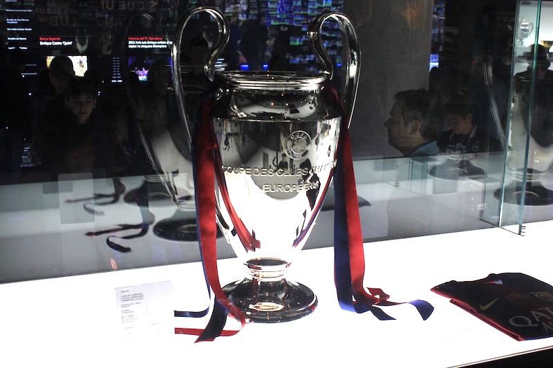 Na zwiedzanie stadionu trzeba poświęcić około 2 godzin. Dużo turystów przed kasami i wejściem do muzeum, dlatego bilet wstępu zalecam kupić dużo wcześniej – za pośrednictwem oficjalnej strony klubu – Camp Nou Experience – Tour & Museum . Bilet ważny jest jakieś pół roku od daty zakupu. Ceny biletów przedstawiają się następująco: 23 euro dorośli, dzieci od 6 do 13 roku + seniorzy – 18 euro, dzieci do 5 lat za darmo. Warto jednak śledzić promocje na wymienionej przeze mnie stronie. Mnie udało się kupić za 50% ceny bo kupowałem w „Black Friday”. Bilet dostajemy mailem – możemy wydrukować je w domu lub też dodać je do aplikacji Wallet (iPhone) czy PassWallet (Android). Ja korzystałem z Wallet w iPhonie. Przez bramki do muzeum przechodzimy sprawnie i szybko skanując kod 3D znajdujący się na bilecie. Po wejściu do muzeum można wypożyczyć audioguide za 5 euro. Po kolei możemy oglądać zgromadzone tu eksponaty a następnie wejdziemy na stadion. M.in. zobaczymy: