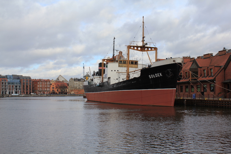 Przy spichlerzach zacumowany jest Sołdek. „Sołdek” to pierwszy zbudowany przez polski przemysł stoczniowy statek pełnomorski – jest to rudowęglowiec o unikatowej nitowanospawalnej konstrukcji, 4 ładowniach. Projekt wstępny statku opracował zespół polskich konstruktorów pod kierunkiem mgr inż. Henryka Giełdzika. Opracowanie dokumentacji warsztatowej do budowy statku zlecono francuskiej stoczni Augustin Normand w Hawrze. Budową statku w utworzonej 19 października 1947 roku Stoczni Gdańskiej kierował inż. Jerzy Doerffer (późniejszy profesor i rektor Politechniki Gdańskiej).Do 2 stycznia 1981 roku „Sołdek” odbył 1479 podróży morskich. W ciągu 31 lat eksploatacji statek przewiózł ponad 3,5 miliona ton ładunku i zawinął do ponad 60 portów. Statek można zwiedzać od ładowni, maszynowni, poprzez kajuty czy mostek kapitański. Polecam.