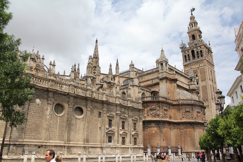 Katedra Najświętszej Marii Panny w Sewilli – jest największym i jednym z najwspanialszych gotyckich kościołów na świecie. Powstała w latach 1402–1506 na miejscu meczetu z lat 1184–1196. Pozostawiony minaret, Giralda, o wys. 97 m wkomponowano w bryłę kościoła, uzupełniając o dzwonnicę. We wnętrzu zwracają uwagę kaplice – Capilla Mayor i Capilla Real, chór i grobowiec Krzysztofa Kolumba. Ja udałem się do katedry – aby właśnie zobaczyć mauzoleum tego wielkiego podróżnika, który otworzył Hiszpanom drogę do Nowego Świata i jego bogactwa. Katedra mieści się tuż obok pałacu Alcazar i Hotelu Alfonso XIII – gdzie zazwyczaj parkują wszystkie turystyczne autokary. Kierując się w kierunku katedry – mijamy informację turystyczną – polecam odwiedzić ten punkt i nabyć bezpłatne mapy, przewodniki czy też uzyskać bieżącą informację co interesującego w danym dniu odbywa się w Sewilli.