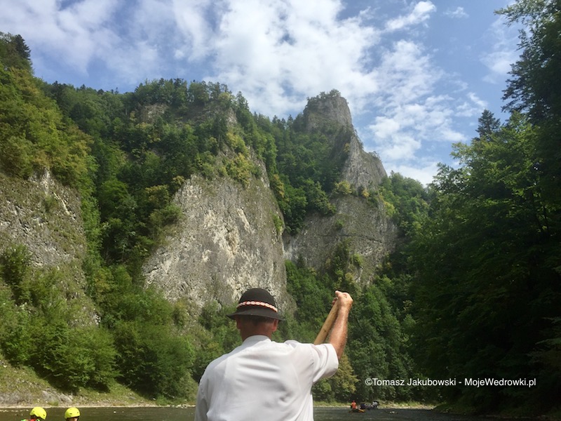 Ale dość tych faktów. Czas wsiąść na tratwę i rozpocząć ten rejs. Na tratwie mieści się 12 osób plus 2 flisaków. Spływ rozpocząłem leniwie w Sromowcach, płynąc z prądem Dunajca. Stan wody jest niski, tak więc widać wyraźnie kamieniste dno rzeki. Jednak wzrok podąża w kierunku Pienin – gdzie w oddali widać masyw Trzy Korony. W dalszej części spływu Dunajec pokazuje swoje groźne oblicze – spiętrzenia i zakręty rzeki, na których tratwa aż podskakuje na falach. Płynąc przez Pieniński Park Narodowy podziwiam piękno naszych polskich gór jak i okolicznej przyrody. Mijam szczyty Trzech Koron (Wysoka Kaśka, Gruba Baśka i Kudłata Maryśka) , Siedmiu Mnichów i Sokolicy. Trudno opisać słowami otaczające piękno przyrody, tak więc nie pozostaje nic innego jak zaprosić Was do uczestnictwa w spływie i podziwiania na własne oczy tych przepięknych krajobrazów. Spływ średnio trwa około 2 godzin. Przystanią docelową jest Szczawnica. W najwęższym miejscu Dunajec ma 12 metrów szerokości i prawie 12 metrów głębokości.