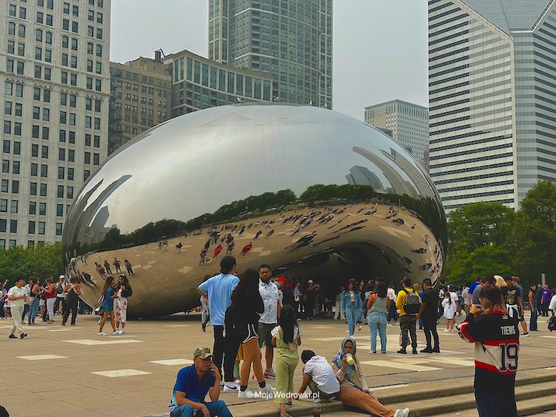 Chicagowska fasolka czyli Cloud Gate waży 110 ton, ma 20 metrów szerokości i 10 metrów wysokości. Jest pokryta płatami stali, które zostały dokładnie wypolerowane, odbijają się w niej wykrzywione twarze amatorów fotografii, wieżowce Downtown Chicago oraz niebo. Zaprojektowała ją znana na całym świecie Anish Kapoor. Przy projekcie twórca inspirował się płynną rtęcią, która perfekcyjnie gładka idealnie odbija otaczające ją obrazy. Jest to jeden z obowiązkowych punktów w mieście. Dla chcących mieć trochę więcej prywatności przy robieniu zdjęć z fasolką polecam godziny poranne. Ja byłem tam po południu i tłum ludzi ciągle przewijał się wokół niej.