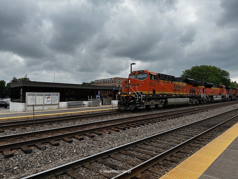 Kolejny dzień – zaplanowaliśmy podróż do Chicago. Poranek przywitał nas parną pochmurną pogodą. Stacja ładna, kilka osób czekało na pociąg. Chcieliśmy kupić bilet – ale kasa czynna w godzinach 10 – 15.00. Wow. Zakup biletu u konduktora jeśli kasa zamknięta (bez mandatu), albo zakup przez internet. Cóż. Wsiedliśmy do pociągu i czekaliśmy na konduktora. Za chwilę się pojawił i skasował nas – zgodnie z cennikiem przejazdu (niecałe 7 $ za osobę) Uff. Pociąg dojechał czasowo. Wjechaliśmy na Union Station i rozpoczęliśmy zwiedzanie Wietrznego Miasta.