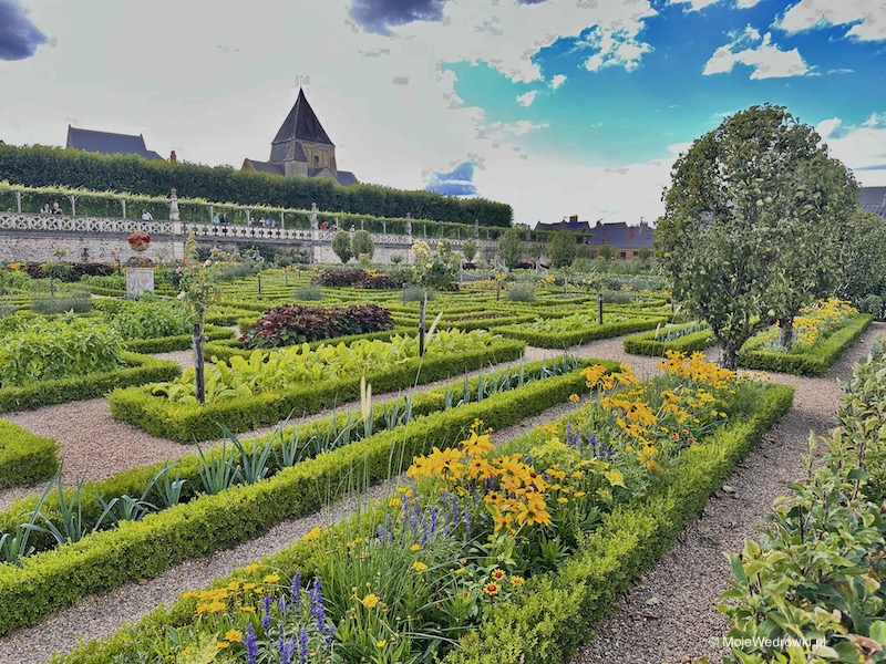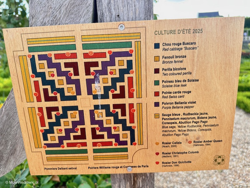 Najbardziej charakterystyczny element, podzielony na dziewięć kwadratowych grządek o różnych wzorach. Znajdują się w nim różnokolorowe warzywa, które są sadzone tak, by tworzyły ozdobne kompozycje. Przed wejściem do tych ogrodów znaleźliśmy tabliczki informujące jakie odmiany roślin w danym roku tworzą piękną kompozycję ogrodu.