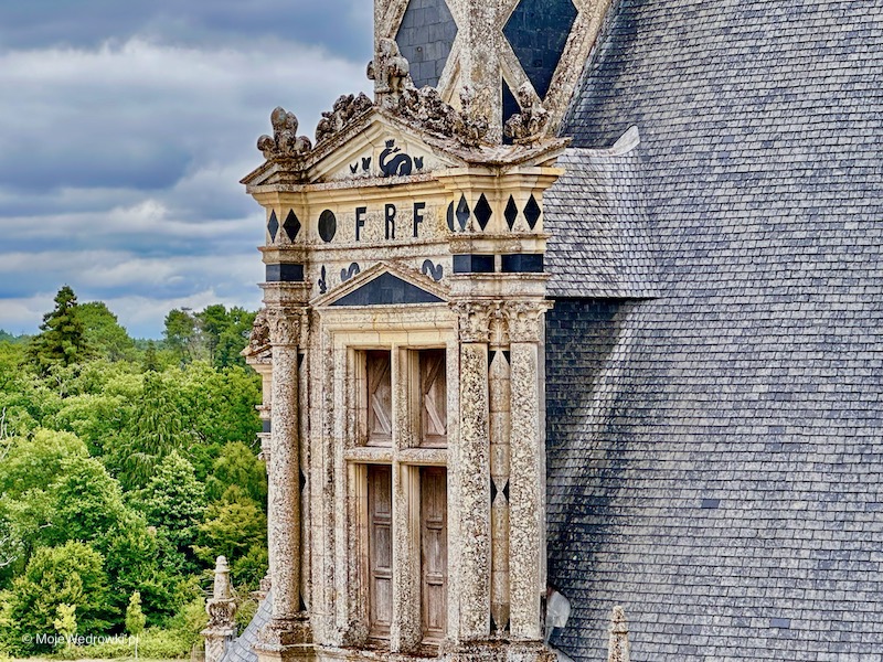 Ta klatka schodowa jest przepiękna i można powiedzieć nadająca dodatkowego splendoru zamkowi. Są one usytuowane na wewnętrznym dziedzińcu. Zamek otoczony jest rozległym parkiem i stanowi ważny zabytek Doliny Loary. Budowa zamku rozpoczęła się w 1519 roku z inicjatywy króla Franciszka I, który chciał stworzyć luksusową rezydencję myśliwską. Zamek łączy elementy renesansu włoskiego z tradycyjną architekturą zamków obronnych. Centralnym punktem zamku jest spiralna klatka schodowa, która pozwala na jednoczesne wchodzenie i schodzenie bez krzyżowania się dróg, co przypisuje się Leonardowi da Vinci. Zamek ma 440 komnat, 365 kominków i 800 rzeźbionych kapiteli (sic!). Nie sposób było wszystkiego zobaczyć, jednakże każda sala jest przepięknie udekorowana, kominki posiadały również udekorowane siatki kominkowe.
