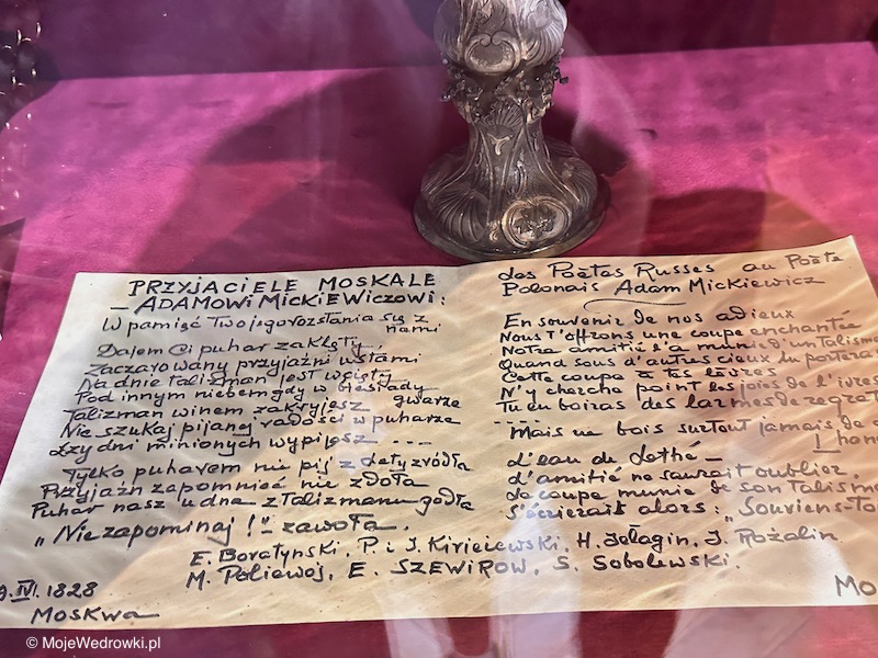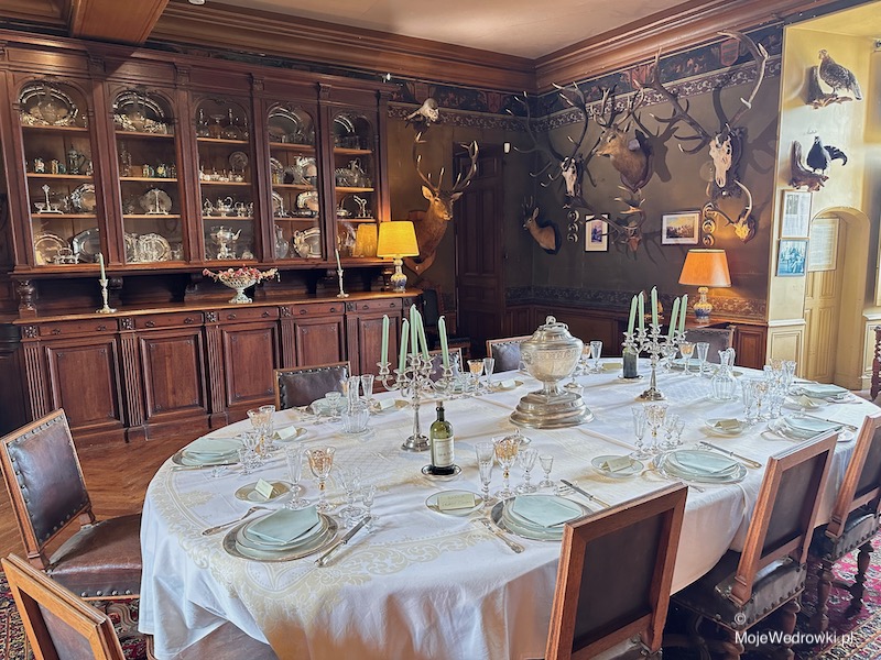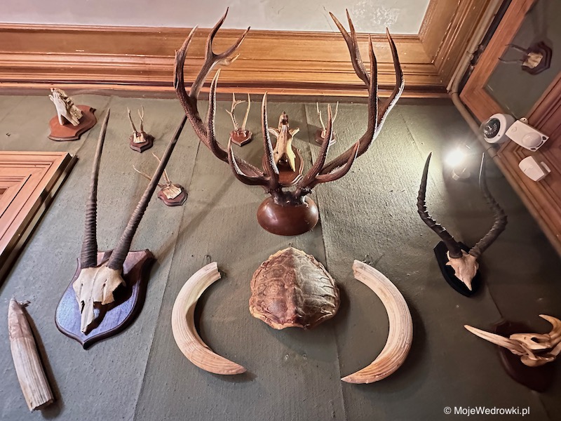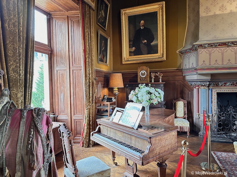 W zamkowych komnatach zobaczyliśmy oryginalne elementy wystroju, m.in. salę rycerską z kominkami i malowidłami, bibliotekę z zabytkowymi zbiorami oraz liczne polskie herby, obrazy przedstawiające rodzinę Branickich, Potockich i Reyów oraz sceny historyczne. Wnętrza są urządzone sprzętami i dziełami sztuki sprowadzonymi z Paryża. Wnętrza utrzymują klimat stylu II Cesarstwa z polskim duchem. Ponadto eksponowane są trofea myśliwskie, broń europejska i wschodnia, a także dzieła malarskie i rzeźby. Zwiedzamy zamek sami, ale wszędzie jest nadzór CCTV. Przechodząc z pokoju do pokoju skrzypi pod nogami klepka – co dodatkowo dodaje kolorytu zamkowym przestrzeniom.
